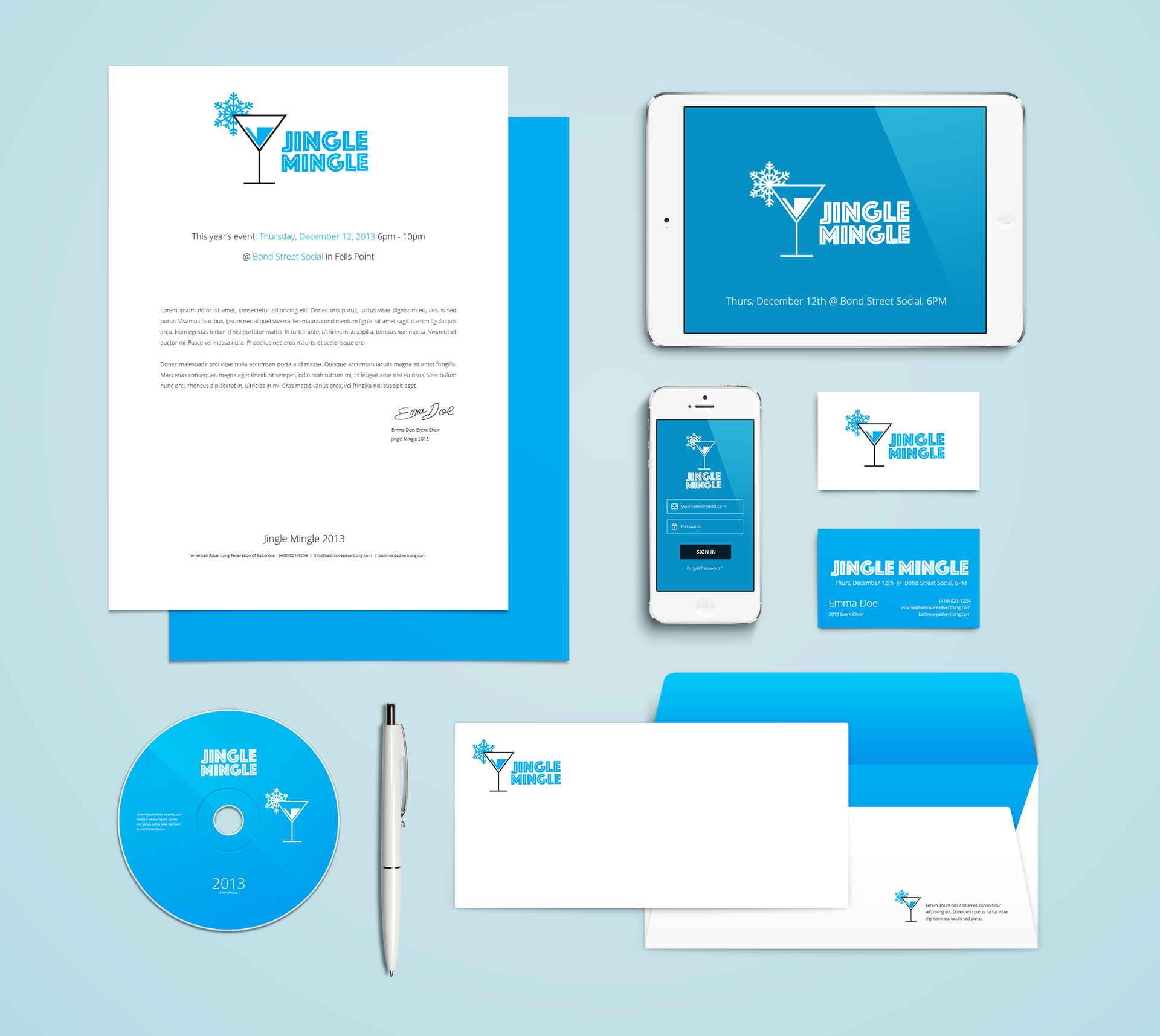 Event Identity developed for a holiday party, sponsored by the American Advertising Federation of Baltimore.