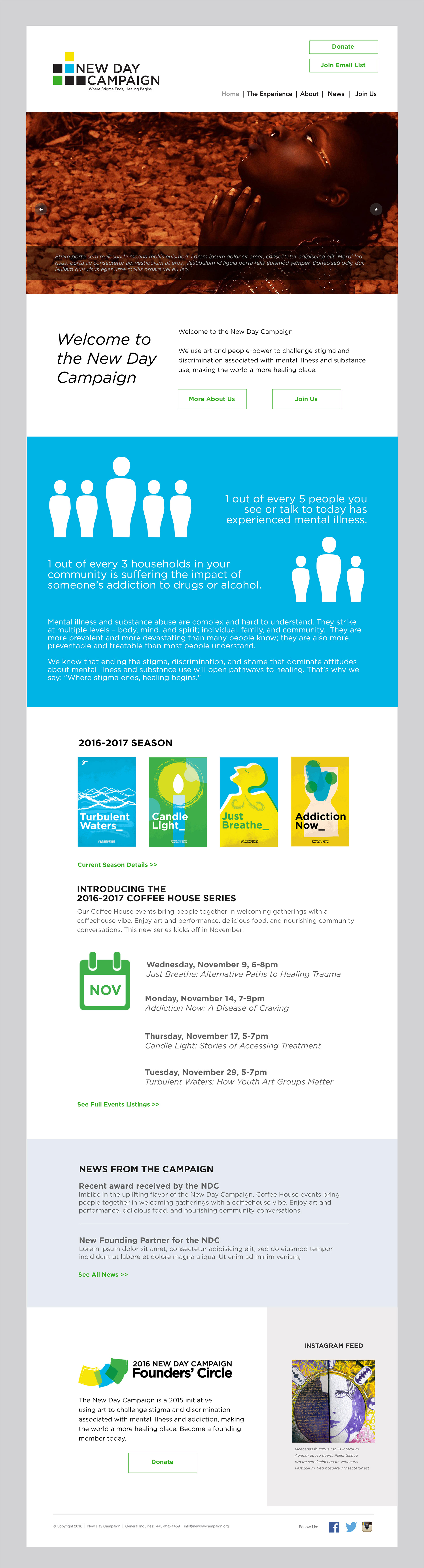 Web design (main landing, left and interior landing, right) introduces people to the New Day Campaign and connects them with the mission and the experience of the events.